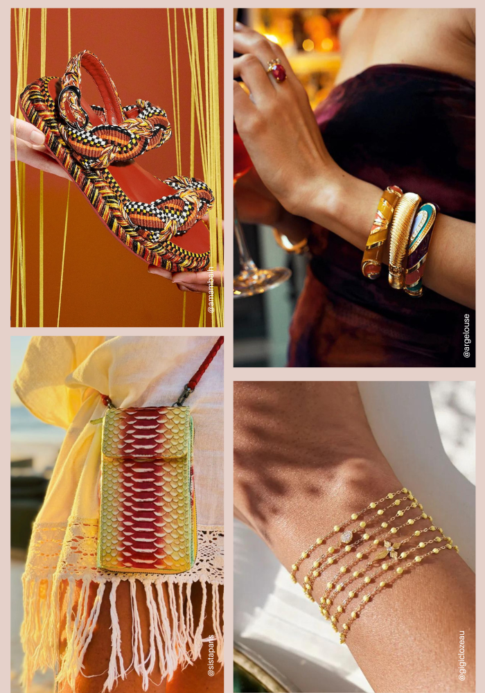 Pour les accessoires, Gigi Clozeau sublimera vos tenues avec des bijoux délicats qui ajoutent une touche subtile mais éclatante aux looks estivaux. Les colliers en perles de résine aux couleurs vives rappellent les couchers de soleil du Sud de la France, apportant fraîcheur et gaieté. Portés seuls ou superposés, ces bijoux s'accordent à merveille avec des pièces de la marque love and let dye par exemple. Si vous préférez des accessoires plus imposants, les marques Aurélie Bidermann ou Argelouse ajouteront une touche distinctive et tendance à vos tenues. Leurs bracelets colorés, agrémentés de détails élégants, habilleront vos poignets et vous plongeront dans le mood des escales estivales.