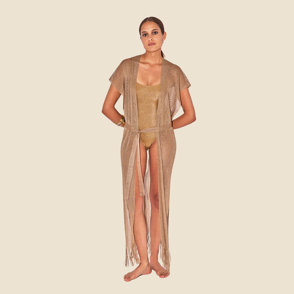 Cap sur un été haut en couleur avec un look à l’énergie solaire assumée ! Le maillot Tessa Magic, aux reflets vibrants, devient la pièce centrale de cette silhouette pleine de pep’s. On l’accessoirise avec les sandales Disco Lurex doré pour une touche festive à toute heure, et le sac Rose-Marie naturel & noir, entre élégance et décontraction.