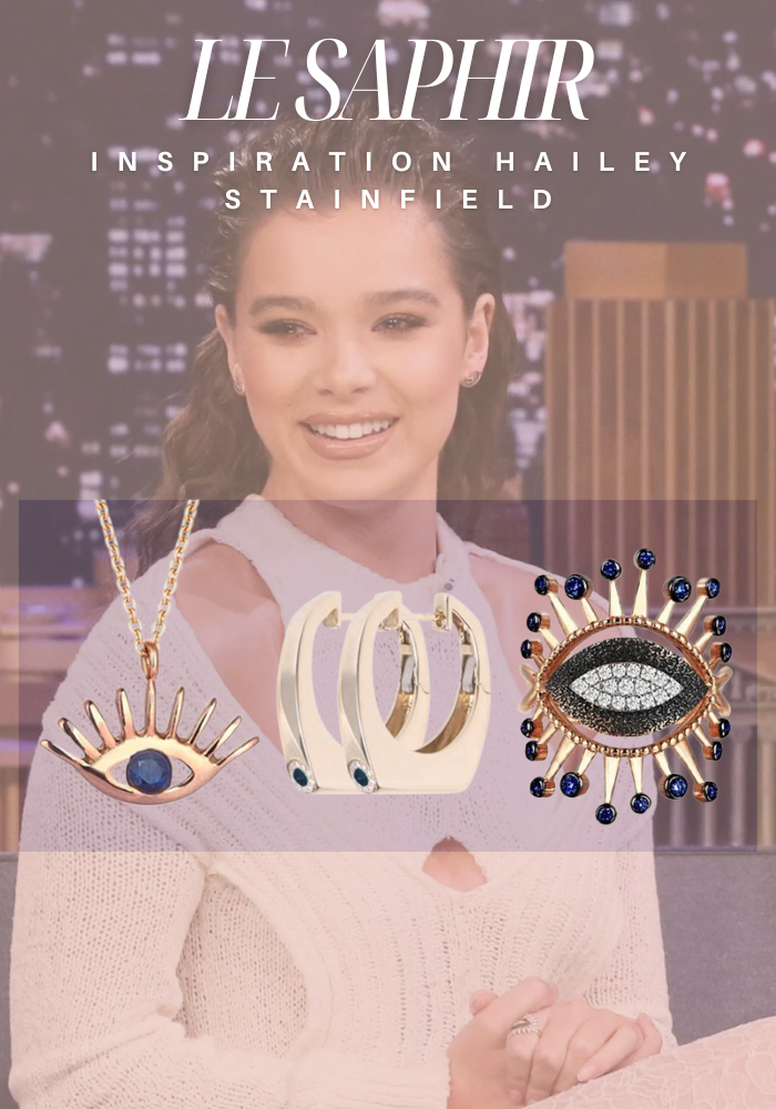 For a Hailey Steinfield look, opt for the Kismet by Milka 10th Eye Eternal Vision Ring and the Rainbow K Grace Nano Sapphire Hoop Earrings. To complete the look, add the Kismet Evil Eye Necklace.