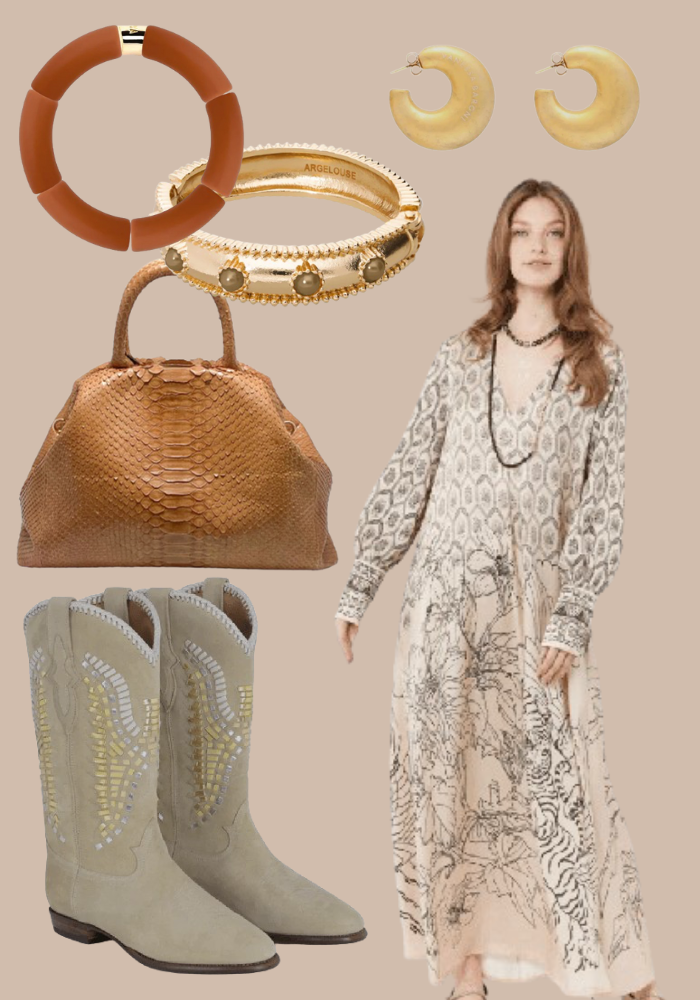 To wear Midnight boots with style, you can opt for a bohemian look. Start with this long dress à la Brigitte Bardot and add this bag from the Sista Paris brand. Accessorize your outfit with an Argelouse bangle , a Parabaya bracelet and Vanessa Baroni earrings .