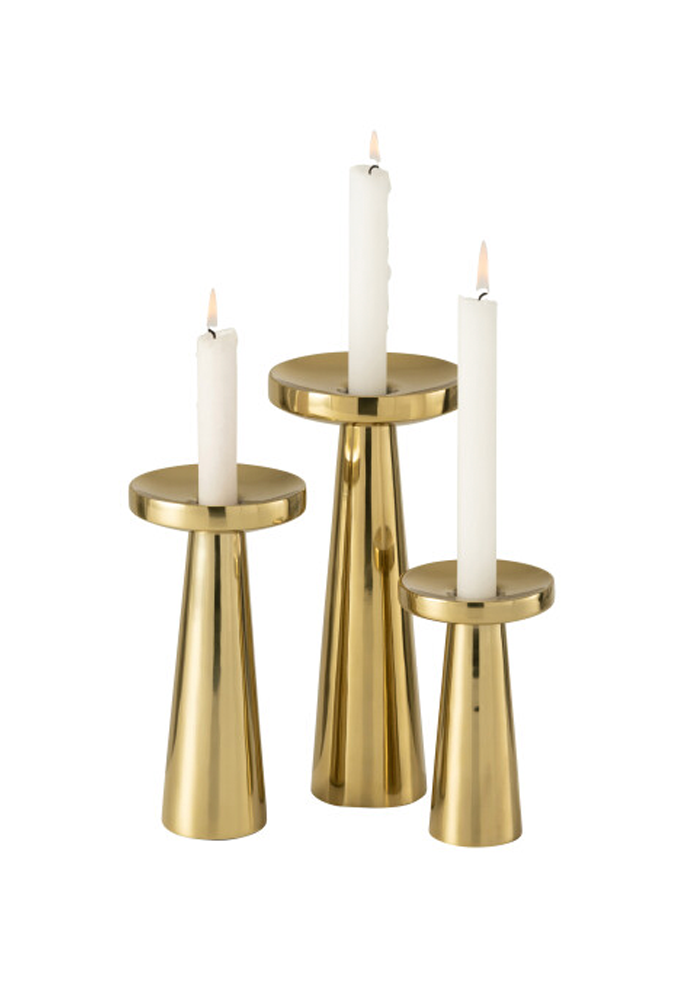 Gold-plated steel candle holder with a flat circle on top.