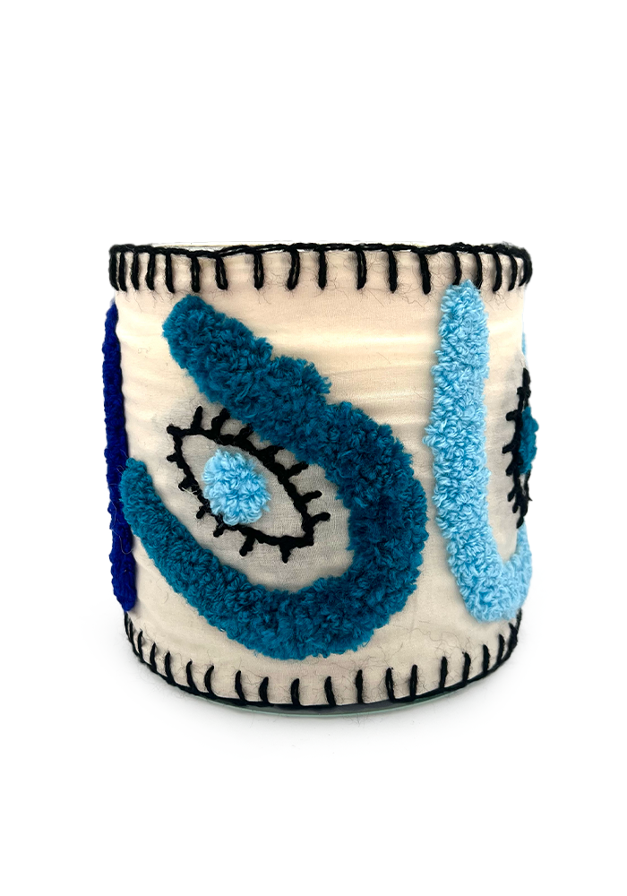Scented candle with 4 wicks surrounded by patterned fabrics.