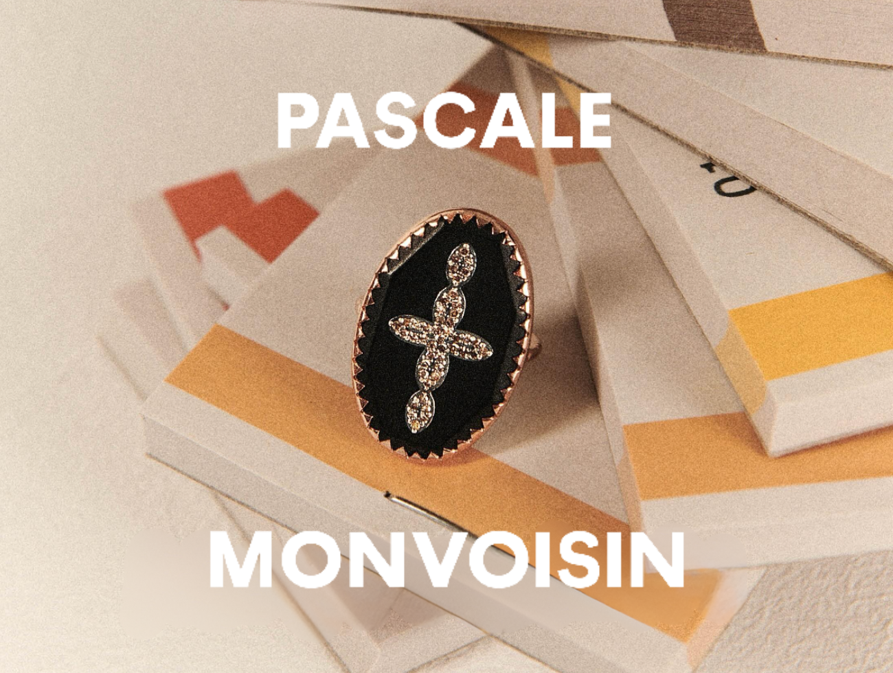 Eddie necklace with a braided cord in shades of yellow, a freshwater pearl pendant with a diopside set in yellow gold and two rings, one of which is decorated with white diamonds. The necklace fastens with a mother-of-pearl button decorated with the Pascale Monvoisin logo.